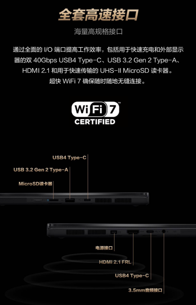 搭配机身两侧配备的全套高速接口,包括2个40Gbps USB4 Type-C、USB 3.2 Gen2 Type-A、HDMI 2.1 FRL、MicroSD读卡器和3.5mm音频接口,全面覆盖户外创作的多元连接需求,无论是直连GoPro相机快速导入素材,还是外接高速SSD拓展存储、通过HDMI 2.1 FRL实现画面实时监看,让素材传输、外接扩展与现场后期无缝衔接,大幅提升全场景移动创作的实用性与专业度。