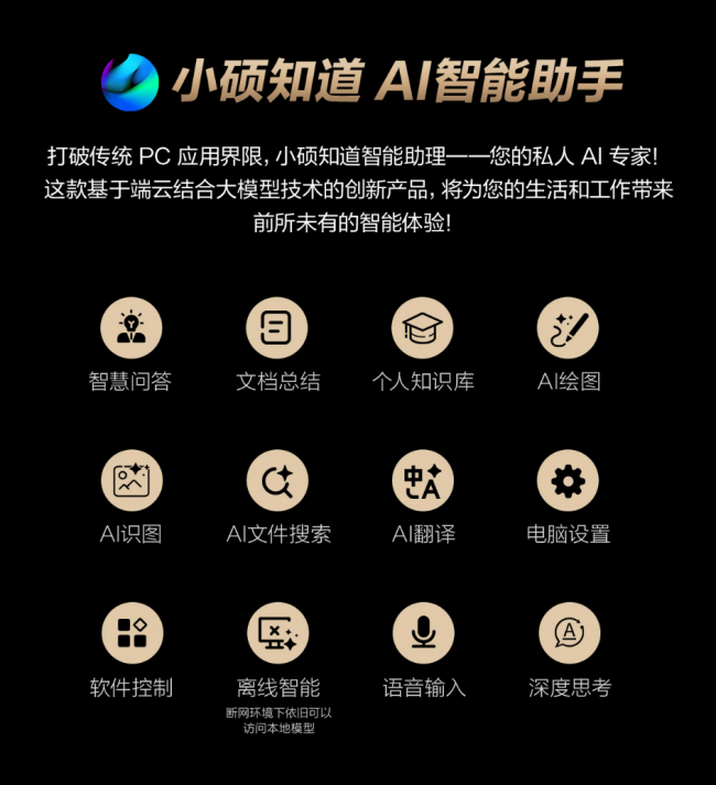 在AI方面,华硕ProArt 创13 2026也做足了功课。内置的“小硕知道”AI智能助手,简直是创作者的贴心搭档,支持智慧问答、文档总结、个人知识库、AI绘图、AI识图、AI文件搜索、AI翻译等功能,不管是整理外文创作资料、快速生成设计草图,还是从海量素材中精准检索目标文件,都能一键搞定。更实用的是,它支持断网本地运行,哪怕在无网络的户外、会议室,也能持续提供AI辅助,让灵感不被网络限制。