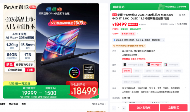 兼顾性能、便携与AI体验,华硕ProArt 创13 2026无疑是当下专业创作者的优选装备。当前购机部分地区可享1500元国家补贴,还能免费领取6个月剪映会员,解锁更多高级创作功能。想要让灵感随时随地高效落地,摆脱场地和设备的限制,上京东搜索#华硕ProArt 创13 2026#,入手这款随身创作神器,开启你的AI创作新篇章。